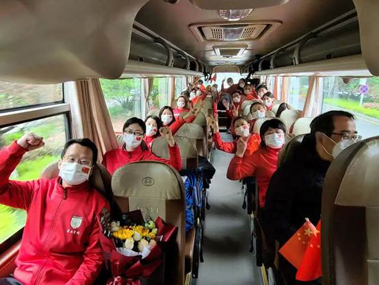 即将回到阔别两个月的上海沃土,在回程的车上,队员们难抑激动的心情,齐声高唱《我和我的祖国》。