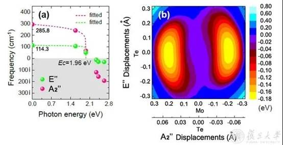 (a) E''以及A2''模式的声子频率随着激光激发态能量的变化。(b)二维势能面,其中横轴代表A2''模式下的约化位移,纵轴代表E''模式下的约化位移,等高线代表能量增量。