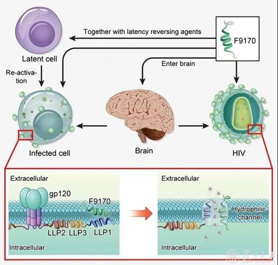 此次筛选得到的多肽F9170来源于HIV-1包膜蛋白(Env)胞内区,能有效抑制以及灭活HIV-1,即在病毒感染靶细胞前就能使病毒失去感染能力,与以往需要等病毒结合靶细胞甚至进入复制周期才发挥作用的药物显著不同。进一步的机制研究表明, F9170靶向HIV-1包膜蛋白胞内区LLP1结构域,多肽与Env胞内区的相互作用可能在病毒包膜上形成亲水通道,最终使得HIV-1的基因组释放,失去感染能力(如图)。重要的是,该多肽同时也能作用于表达了HIV-1 Env的HIV-1感染细胞,以及激活后的HIV-1潜伏细胞储存库,引起感染/激活细胞的坏死,所以F9170或将有望与储存库激活剂一起用于艾滋病的治愈。