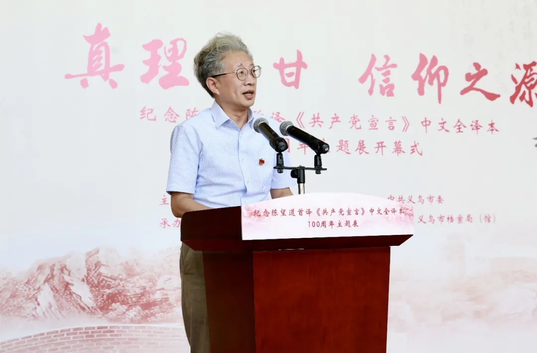 郑泽青在致辞中指出,本次巡展是对陈望道先生的特别纪念,是上海市档案馆与复旦大学的一次深入合作。从上海到义乌,展览不仅呈现陈望道先生翻译《共产党宣言》的前前后后,以及《共产党宣言》对义乌地区革命形势发展所起的作用,展览本身也是两地三方更好服务长三角一体化发展国家战略,充分发挥长三角地区地域相近、人文相亲的优势,携手开发体现“红色文化”特质的档案资源,使之能够在更广范围内实现互联共享的一次有益尝试。他表示,相信更多的人将从这次展览中感受中国共产党人的理想之光、信念之光,而《共产党宣言》所昭示的初心,依然具有坐标原点的重要意义。