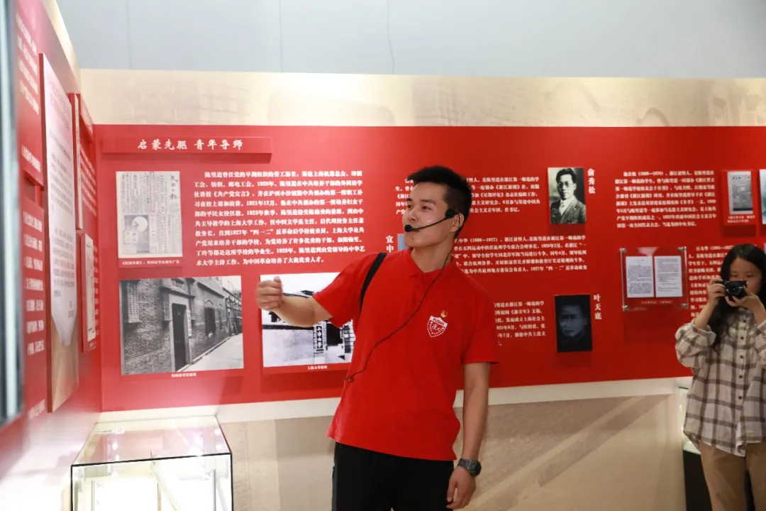 今年6月收到总书记回信的复旦大学《共产党宣言》展示馆党员志愿服务队队员李亚男、许亚云也来到现场担任讲解。在复旦,这群年轻人行走在望道旧居,讲述老校长的生平;这次义乌巡展,更为他们提供了走进老校长故乡,从更加全面深刻的角度理解和传播“宣言精神”的机会。