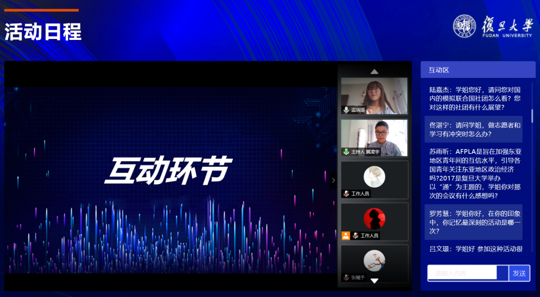 复旦分营的最后一项活动,是由复旦大学的本科生郭天成、温瑞琪、朱思窈、张曦予为营员们带来的“朋辈互动交流”。营员们在分享会中聆听了学长学姐们的抗疫服务经历和学术故事,从复旦青年担当和学术创造视野两个维度了解了大学生活。