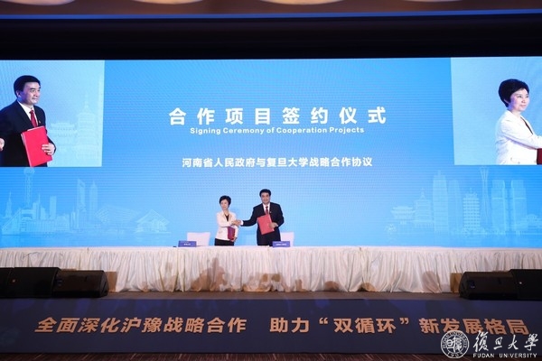 复旦大学党委书记焦扬与河南省副省长何金平代表省校双方签署战略合作协议。