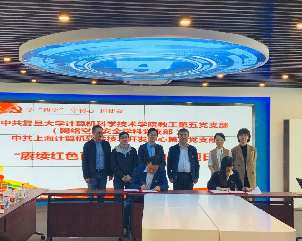 近日,计算机科学技术学院教工第五党支部(网络空间安全学科党支部)与上海计算机软件技术开发中心第三党支部联合举行“学‘四史’、守初心、担使命”主题党日活动,围绕党建共建、人才培养、科技创新和研究合作等进行深入交流,并签署支部共建协议。