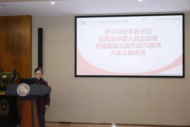 本次主题党日活动还邀请了医院党委书记钱飚带领支部党员们共同学习总书记在纪念中国人民志愿军抗美援朝出国作战70周年大会上的重要讲话精神。钱书记表示,全院党员应积极响应总书记的号召,更加紧密地团结在党中央周围,弘扬伟大抗美援朝精神,雄赳赳、气昂昂,向着全面建设社会主义现代化国家新征程、向着实现中华民族伟大复兴的中国梦,继续奋勇前进。