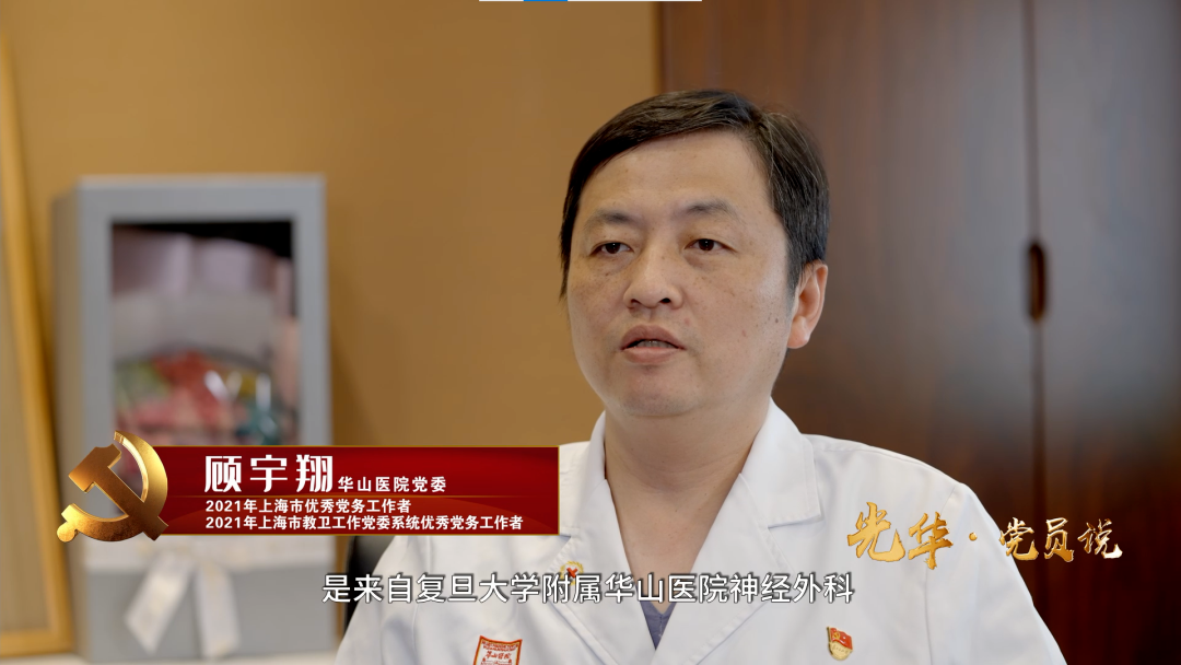 顾宇翔同志,复旦大学附属华山医院虹桥院区副院长、华山医院神经外科第一党支部书记。2003年9月加入中国共产党。曾获得国家卫生健康委脑卒中防治工程突出贡献专家、国家卫计委脑卒中筛查与防治优秀中青年专家、上海市青年五四奖章、上海市卫生计生系统优秀学科带头人等荣誉。