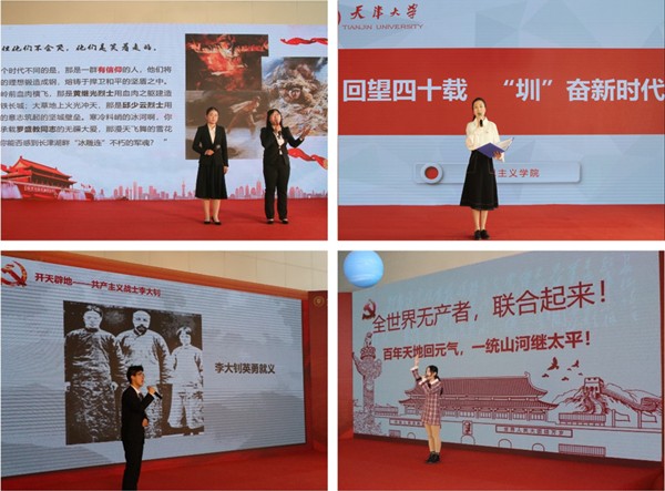 在决赛中,从四个赛区脱颖而出的13支宣讲队伍,围绕党史、新中国史、改革开放史和社会主义发展史中“英雄”“复兴”“创新”“信念”四个主题,搜索图文素材、拟定宣讲内容、打磨讲稿,以主题鲜明、形式鲜活、内容翔实、富有激情的理论宣讲,讲述伟大人物、重大事件、重要理论等,高擎爱国主义伟大旗帜,展现新时代天大学子知史爱党、知史爱国的家国情怀,形成学生群体中的“四史”学习热潮。“宣讲的过程也是学习的过程,我们宣讲队的成员查阅了大量历史资料,梳理了新中国成立71年来不同历史时期发生的重要历史事件,最终确定了用一个家庭的奋斗史折射祖国发展变迁的主线。在这个过程中我们都深切地体会到中国从站起来、到富起来、再到强起来的背后凝结着千千万万个家庭的心血与汗水。”化工学院第三理论宣讲团代表杨天硕说。