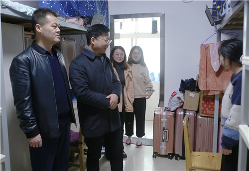 4月12日上午,校党委书记、省政府教育督导专员湛俊三,副校长卢波涛、储鑫及相关部门负责人,各学院党总支副书记、副院长深入学生宿舍,走访了解学生宿舍情况。