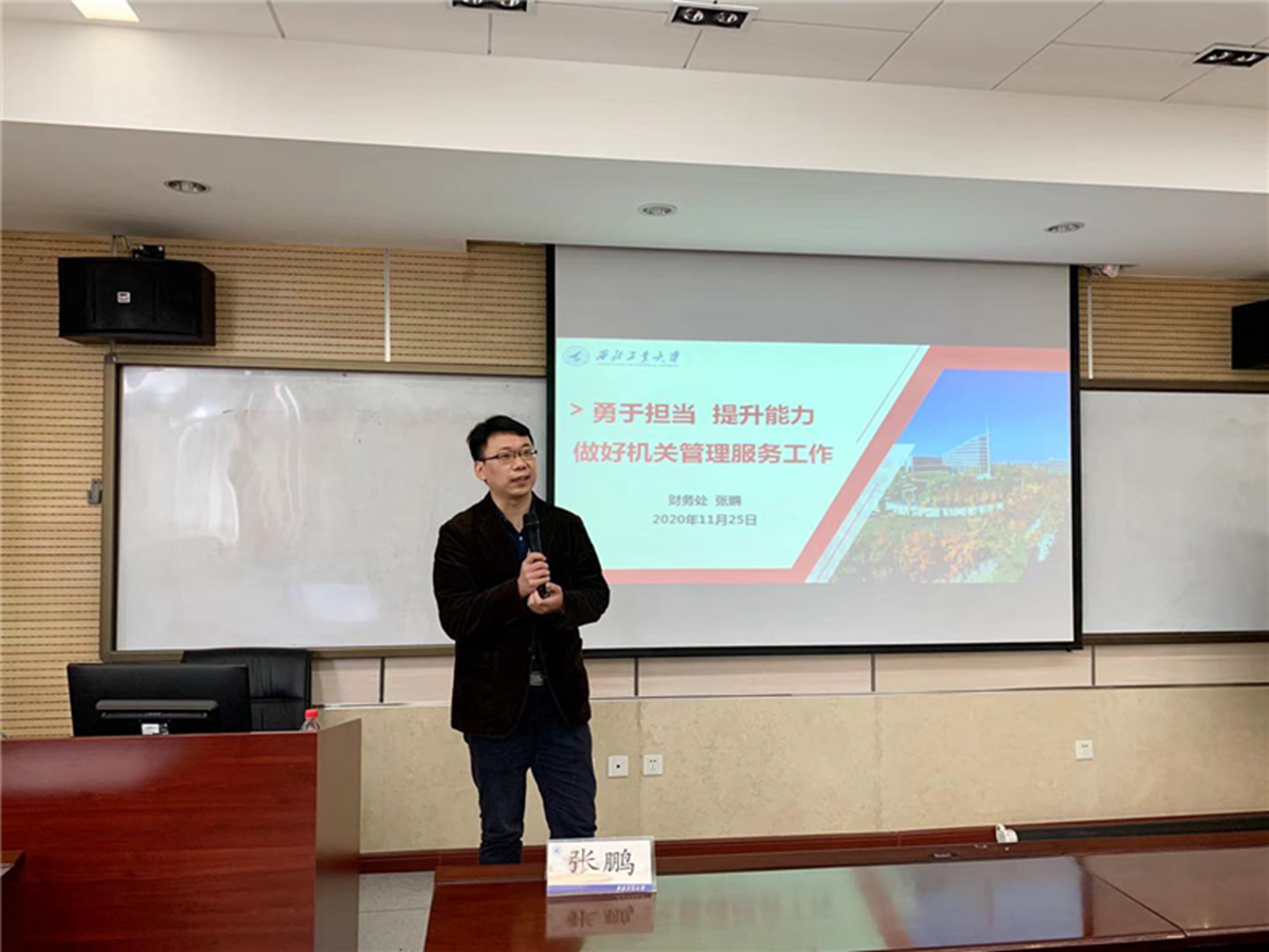 张鹏以《勇于担当 提升能力 做好机关管理服务工作》为题,围绕高校机关作风建设,从当今作风建设相关要求、作风建设问题表现、财务工作心得体会三个方面,结合本校相关文件、方案,分析了学校机关作风建设面临的新机遇与挑战。最后,他分享了财务处作风建设工作的经验,希望机关的青年干部从日常工作出发,主动分析关作风建设中存在的问题,并提高解决实际问题的能力。