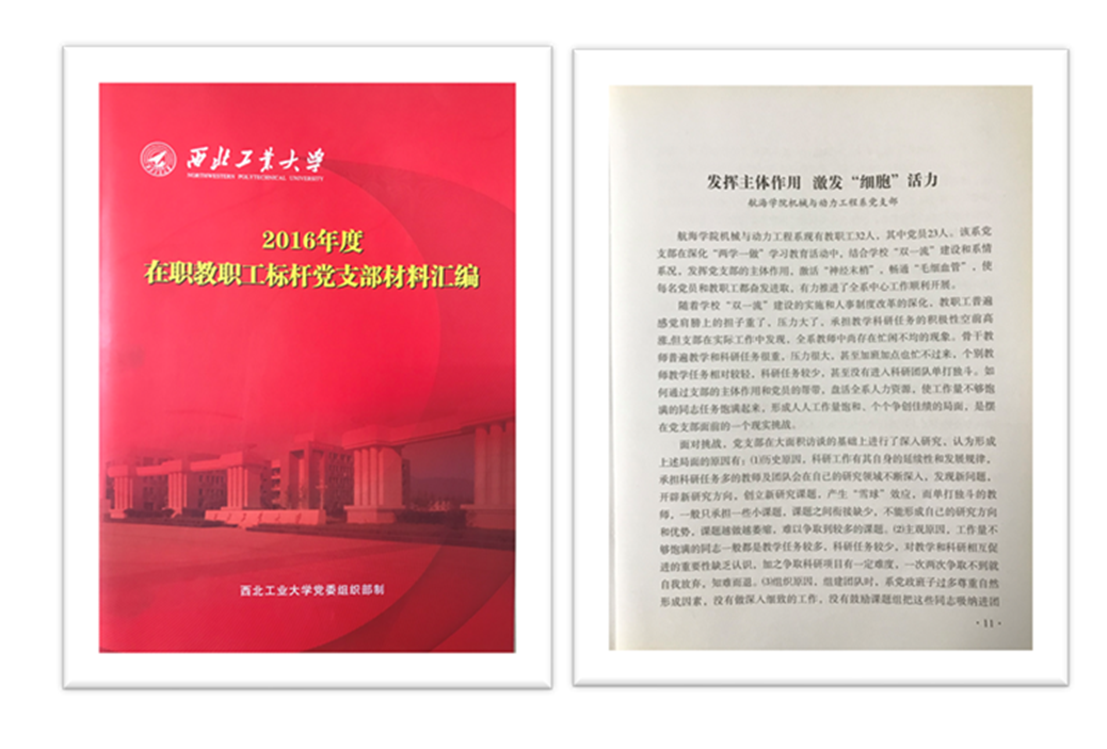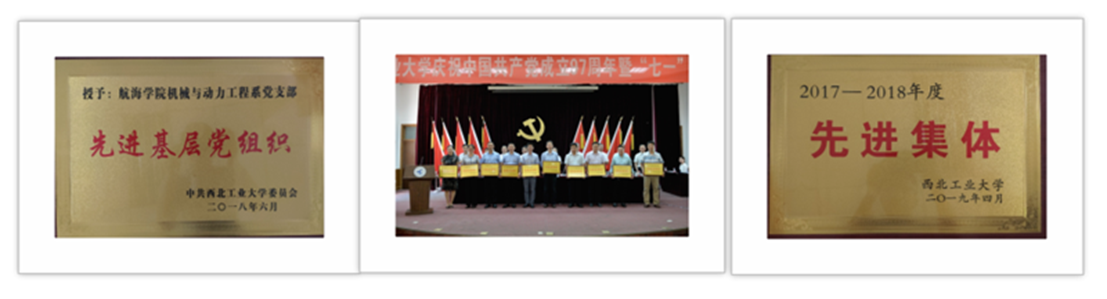 一分耕耘一分收获,经过以上努力,机械与动力工程系党支部获批陕西省新时代高校党建“双创”工作“全省党建工作样板支部”,西北工业大学首批党建工作“样板支部”,西北工业大学第二批“双带头人”教师党支部书记工作室,西北工业大学先进基层党组织,西北工业大学现金集体等荣誉。