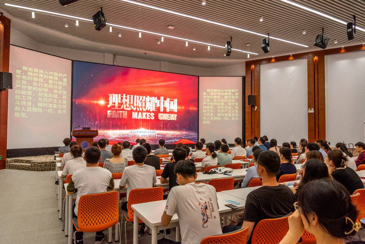 表彰大会在庄严的国歌中启幕。学院党委书记王正汹带领全体新发展党员在党旗下进行宣誓,到会的其他党员重温入党誓词。