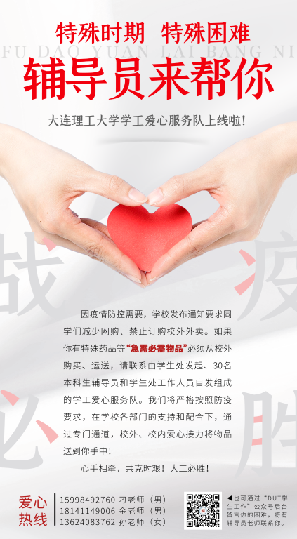 战斗员、勤务员、疏导员、监督员……无论有多少种角色,他们的底色永远是大工辅导员!玄鸟至,春花万枝,有辅导员们在,有无数个和辅导员一样,在普通但不平凡的岗位上坚守的人们在,相信春天必定如约而来,大工战“疫”必定会赢!