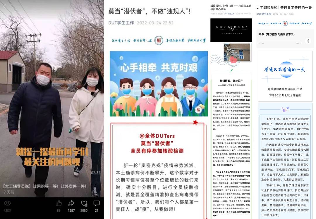 “达哥景宝校园住,带你探索不迷路”,校园里出现了这样一对辅导员CP“达哥&景宝”,他们通过当下最火的探店形式,从引导学生减少网购、拒绝外卖,讲到学校设立的“圆梦屋”,诙谐幽默“说正事儿”的形式获得了学生们的一致点赞,这就是精心策划打造的《大工辅导员说》系列栏目,全网累计播放量、浏览量超23万。辅导员们用喜闻乐见的形式,在新媒体平台传递着一个又一个最温暖和最感动的声音。《纸短情长,静待花开——来自大工辅导员的心里话》短视频被学生刷屏,最朴素的情感往往能直击人心;41个不同民族的学生代表讲出“抗疫心里话”,民族团结在这一刻得到了最好彰显;辅导员亲自创编《Hello麦浪》电台栏目,每晚10点用温暖的声音洗去所有的疲惫和不安。大工辅导员共筑网络思政教育同心圆,齐心协力在这场战疫中讲好特殊而又鲜活生动的“思政大课”,让思政教育既暖心又贴心更走心。