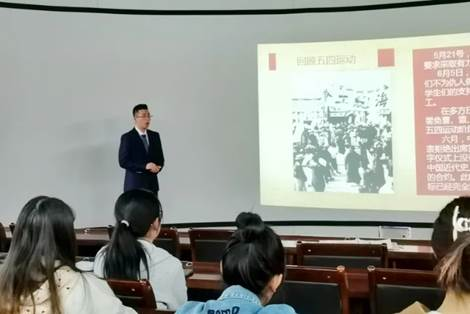 接着,谷泽煜通过电视剧《觉醒年代》中讲述五四运动的视频片段,让我们再次身临其境,视频中北大学生郭心刚(原型郭钦光)带着病体仍然坚持全程的爱国游行活动,给我们留下了深刻的印象。