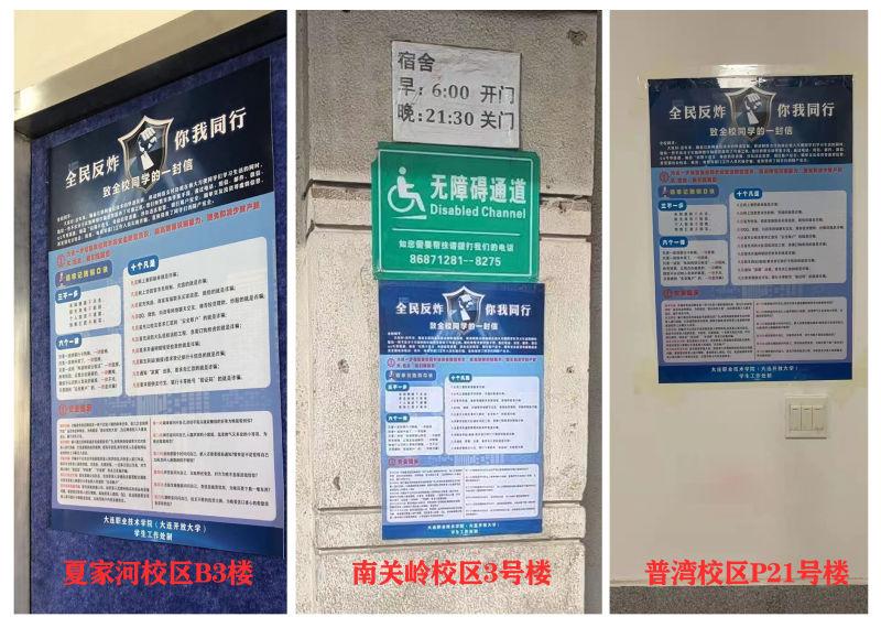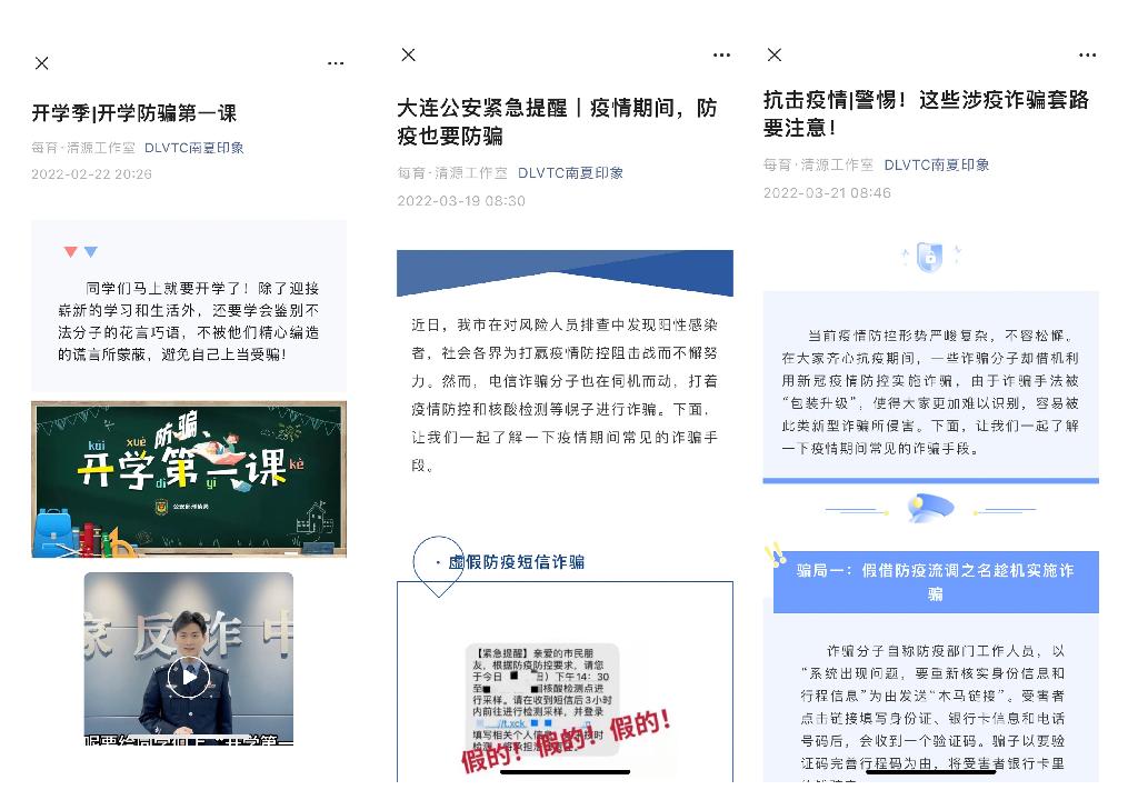 开学至今,学生工作处开展形式多样的“线上线下”反诈防骗宣传活动,在夏家河子、南关岭、普湾等三个校区的住宿、教学、食堂等公共区域设计张贴《全民反诈 你我同行——致全校同学一封信》宣传海报30余张,向全校学生下发安装“国家反诈中心APP”宣传单累计8000余份。同时学生工作处利用“DLVTC南夏印象”学生工作微信公众号积极开展线上反诈防骗知识宣传,推出多篇反诈防骗推文,做到反诈防骗知识深入校园每个领域、每个学生群体,实现“线上线下”全覆盖,提醒学生时刻筑牢反诈防骗防范意识。