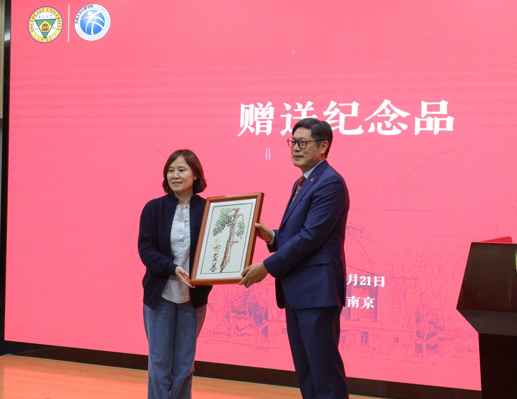 讲座结束后,交通学院党委书记陈怡向唐伯明教授赠送东南大学六朝松彝绣作品作为纪念品。六朝松是所有东大人的精神图腾,这幅彝绣作品来自东南大学定点帮扶十周年的云南楚雄南华县,同时云南也是讲座主题滇缅公路的起点,这份具有多重含义的纪念品代表了校友与母校之间不可分割的联系以及母校师生对唐伯明校友的衷心感谢和崇高敬意。