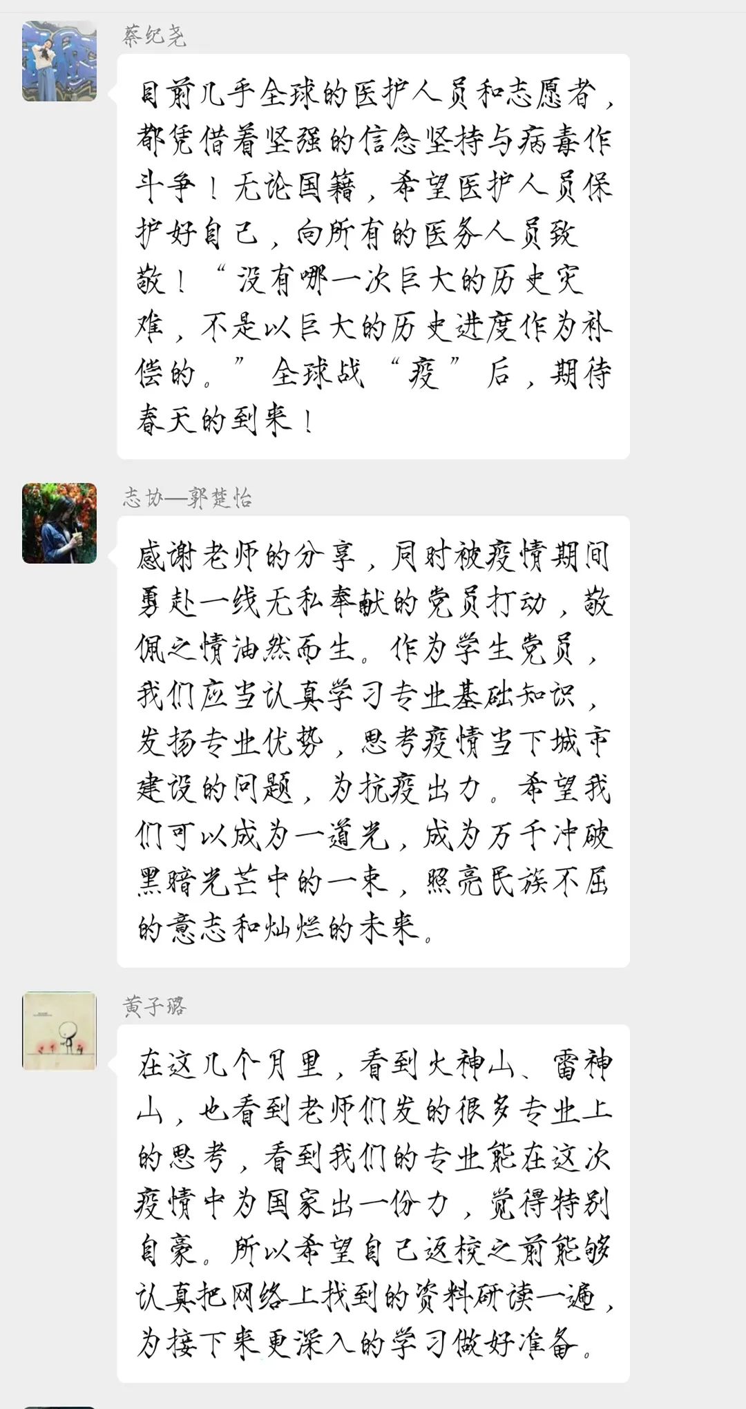 三、 关心身边包括海外的同学、群众,相互鼓励,共同度过特殊时期。”