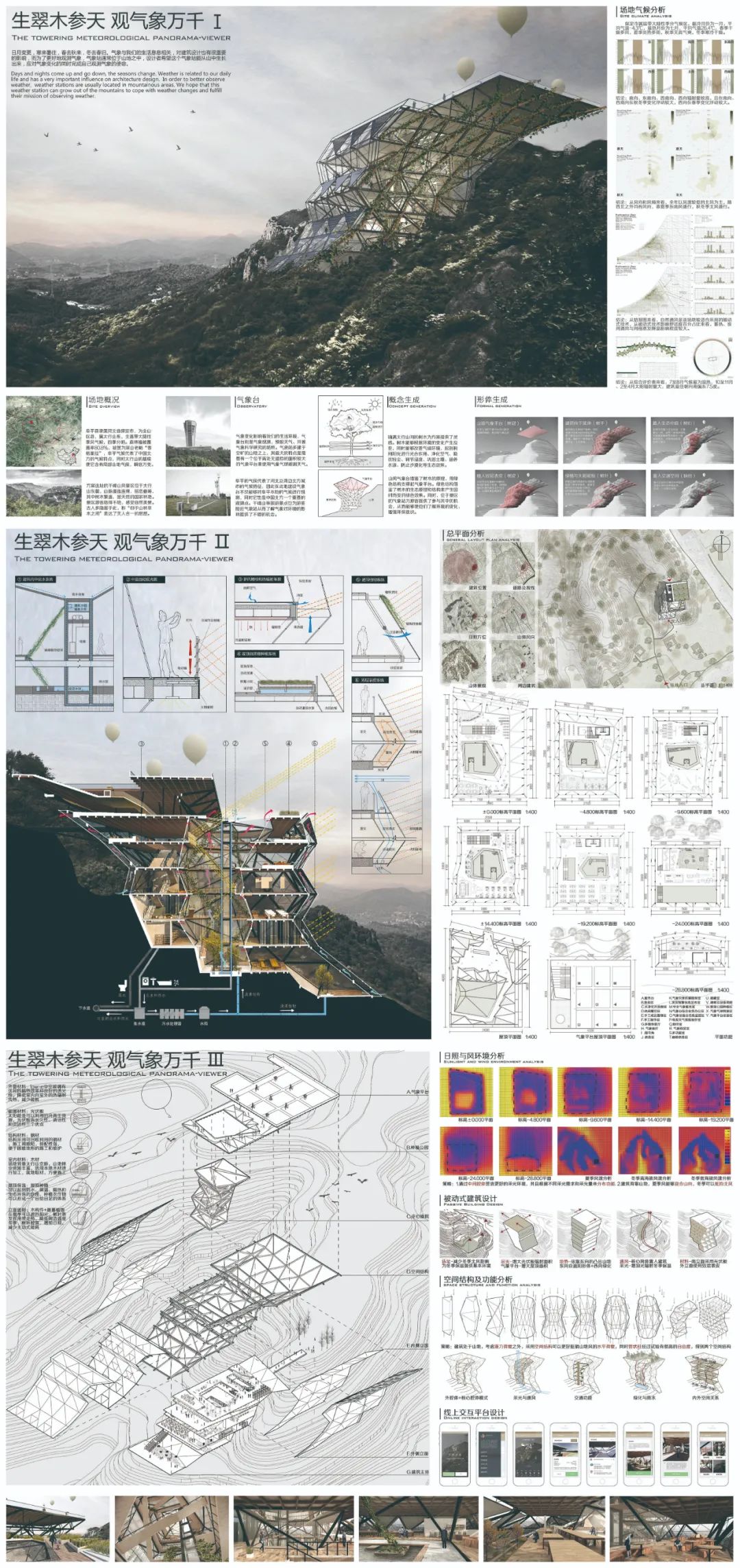 “生翠木参天 观气象万千”设计最有特点的地方是将科学原理与建筑设计结合得非常妥帖。建筑体量的处理、建筑形式的深化、建筑细部的推敲,均巧妙依托自然条件,结合自身功能的需求以及遮阳、通风的考量,进而展示了建筑的创造是如何基于本体功能、气候响应、自然环境等完成的。设计者采用了辅助模拟软件对气候响应做了初步预判,而这些模拟的结果显然影响到了设计的形式生成。尤为突出的是设计者自身杰出的建筑学图面表达能力,令本来已经相当出色的建筑创造又增新辉,完成的全套图纸完美诠释了设计者的意图。