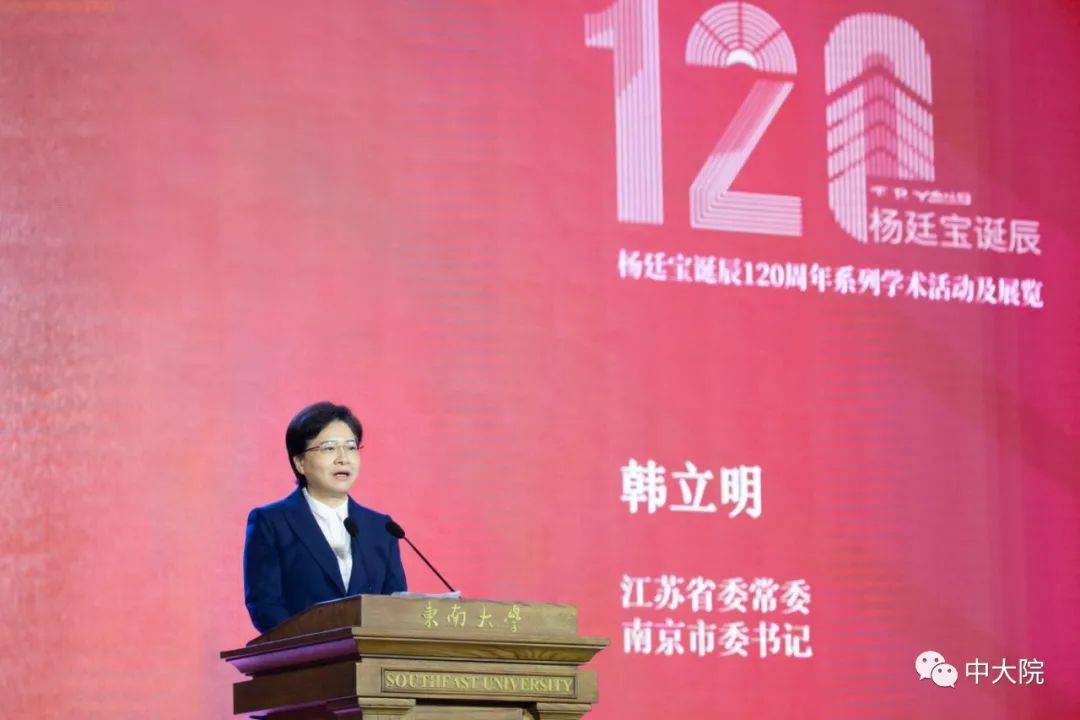韩立明代表市委市政府对杨廷宝先生的杰出贡献和精神风范表示深切缅怀,回顾了杨廷宝先生和他开创的事业对于南京的意义。她说,上世纪30年代后,以杨廷宝等为代表的中国第一代留洋建筑师学成归国后,以满腔爱国热忱和非凡才华,为中国建筑事业和建筑教育事业作出了重大贡献。杨廷宝先生留下的建筑经典成为刻在南京城市肌理上的永恒记忆,开拓的建筑教育事业成为南京科教名城的重要组成部分,推动的国际交流合作成为南京扩大世界影响力的先行探索。迈进新征程,南京确立了全面建设人民满意的社会主义现代化典范城市的奋斗目标。建设典范城市,文化是重要内涵,规划和建设是重要手段。我们将一如既往保护和利用好杨廷宝先生等大师和历史留下的建筑文化遗产,延续城市文脉,传承优秀文化,激发创新活力,提升空间品质;同时也期待建筑学界各位大师、业界各路精英,多提宝贵意见、多出精品力作,共同在这方创新活力与人文魅力交融、古都风韵与时代风尚辉映的热土上,谱写中国现代建筑事业发展的时代华章。