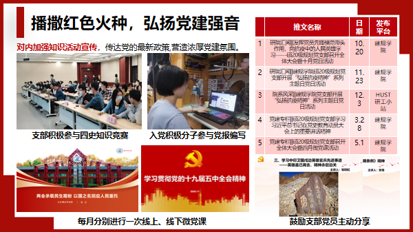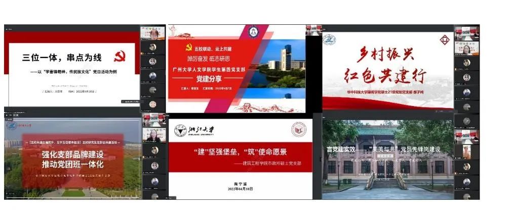 为搭建起中南地区高校间共享共建共融的平台、推动各高校优势资源共享、实现支部发展建设,华中科技大学建筑与城市规划学院联合东南大学建筑学院、广州大学人文学院、华南理工大学建筑学院、浙江大学建筑工程学院开展以“五校共建云端携手,互学互促使命担当”为主题的研究生支部共建活动,本次活动以“云共建”的形式开展跨地区,跨院校,跨专业的党建交流与经验分享,真正让支部发挥“进口袋”、“进身边”作用,培养 “立大志、明大德、成大才、担大任”的优秀青年党员,培养堪当民族复兴重任的时代新人。坚定信念、凝聚力量,扎扎实实做好各项工作,引导师生党员践行初心使命。