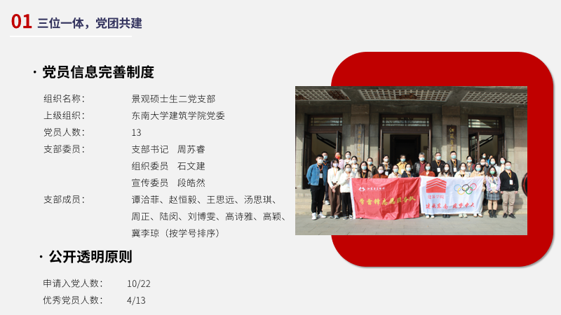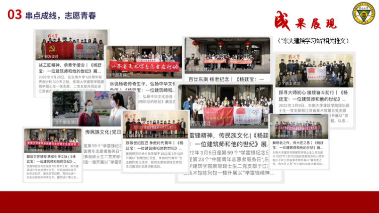 随后,周苏睿同志以“串点成线,志愿青春”为主题,着重介绍了支部特色党日活动:《杨廷宝:一位建筑师和他的世纪》专题展览活动志愿讲解服务。支部秉承“实践促真知,学雷锋精神”的理念开展此次活动,结合学科特色以及东南大学建筑学院一贯秉承的“互助共进”党建作风,将一个活动延展成系列主题活动,挖掘活动的多维度影响,受到了社会民众、学校师生的一致好评。