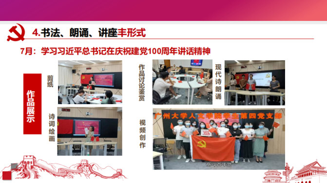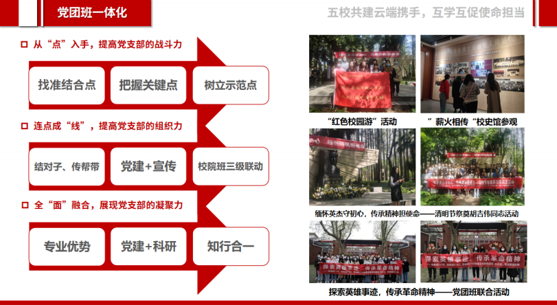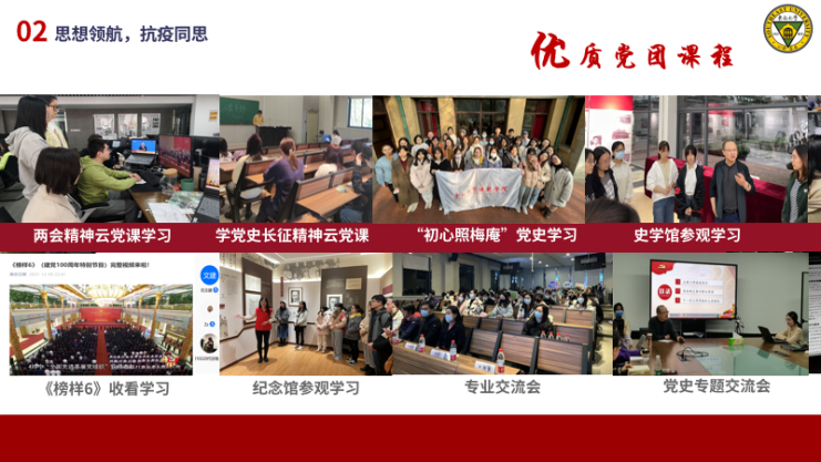 在疫情反复、多点散发的大背景之下,诚挚感谢华中科技大学的组织和邀请,让我们能够在线上云共建、云交流,共同领略来自五所学校七个支部的风采。这是一次精神的洗礼,是一次美的享受,也是高校之间互学互促互进的交流平台。希望本支部今后能坚持落实习近平新时代中国特色社会主义思想,结合专业特色,争取打造具有时代特色、专业底色和鲜红本色的优秀党支部!