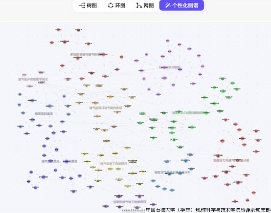 通过AI助教、灵通课堂和AI学伴等实现了个性化、互动式教学, 过程性考核评价,利用大数据、大模型等对学生学习行为和表现进行实时监测和分析,并提供及时的学情反馈,帮助教师及时了解学生需求、优化教学方法、调整教学策略,实现课堂的智慧管理和智能决策。AI助教为学生提供个性化的问答服务,提升学生学习体验。依托《油气田开发地质学》知识图谱,可直观浏览不同主题间的知识关系,带动知识点漫游,形成不同的学习路径。