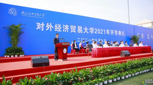 9月9日,对外经济贸易大学校长夏文斌教授在新生开学典礼上为2021级新生上“校长第一课”。夏校长带领新生回顾了建校七十年来一代代贸大人肩负使命、服务国家战略、贡献贸大智慧的历程,勉励新生做有志气的新时代贸大人,坚定理想信念,胸怀强国之志,做有骨气的新时代贸大人,传承贸大精神,锤炼意志品格,做有底气的新时代贸大人,勤奋学习钻研,提升能力水平。国际学院院长蒋先玲作为教师代表向新生们分享了三个大学生涯关键词——“转变”、“读书”、“健康”,鼓励新生尽快转变角色,在惠园增长学识,强健体魄。2020级金融学院博士生胡英琦作为在校生代表、2021级国际商学院2021级本科生彭圣翔作为新生代表分别致辞,号召新生将小我融入大我,在惠园中立志,在青春中追求卓越。
