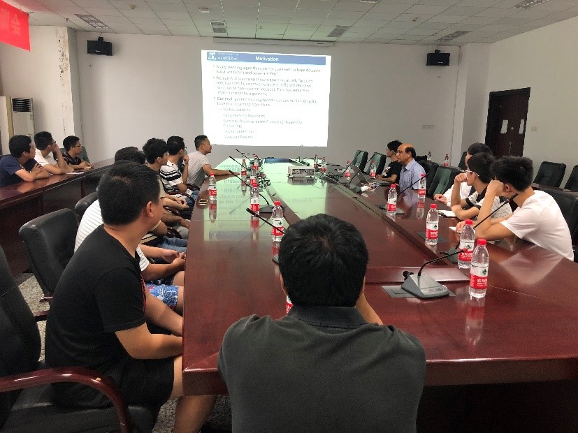 同时,支部教师积极为学生搭建国际化平台,支持学生参与国际合作项目,资助优秀学生去昆士兰大学、新加坡国立大学、悉尼科技大学、阿姆斯特丹大学、奥克兰大学等国外著名研究机构访问实习,参加高水平国际会议,助力培养学生立足人工智能前沿问题,坚定“文化自信”,鼓励学生在国际人工智能舞台踊跃发出“成电声音”,提供“中国方案”,贡献“中国智慧”。与此同时,支部定期邀请相关研究领域国内外著名教授来校指导学生科研工作、做学术报告,如:IEEE/ACM Fellow、新加坡国立大学杰出教授Ooi Beng Chin,IEEE/ACM Fellow、微软研究院首席研究员张正友,澳大利亚科学院与工程院双院士Rao kotagirl教授等,每年组织指导学生开展大型的英文学术报告活动1-2次,邀请国际知名学者亲临现场指导,与此同时,支部老师每周安排的office hour和小组讨论会,这样不仅提供了与专家学者近距离互动交流的机会,也营造了一种“转身遇见名师,随处可见讨论”的良好学术氛围。