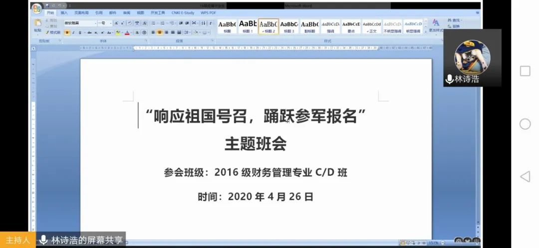 为贯彻落实省市和学校征兵工作站的工作部署,做好2020年我院大学生征兵宣传工作、发动优秀大学生青年踊跃参军入伍,管理学院辅导员党支部党员老师于2020年4月-5月组织2016级毕业班及非毕业班在腾讯会议、钉钉等线上平台召开了共计40余场以“响应祖国号召,踊跃参军报名”为主题的线上班会和网络直播课,通过辅导员和班委讲解政策、退役大学生经历分享等方式,引导大学生自觉参军入伍接受锻炼。