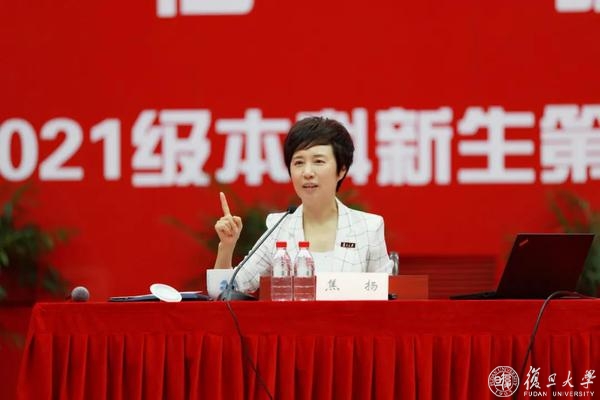 绿、红、蓝、橙、紫——志德、腾飞、克卿、任重、希德五大书院的新生坐满正大体育场。他们高喊着复旦校训、复旦精神、各书院口号。课铃声响起,在一片掌声中焦扬走上讲台,当她问大家我们的共同身份是什么,新生们一起喊出“复旦人”时,她告诉大家“对!这是我们的共同身份。”