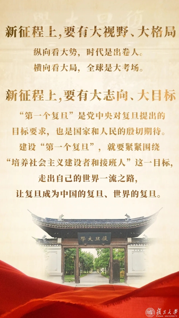 “面对世界百年未有之大变局和国内社会主要矛盾的新变化,“考场”越来越大、“考题”越来越复杂,征途漫漫、惟有奋斗。复旦学子要和祖国人民同行,回答好时代考卷。”