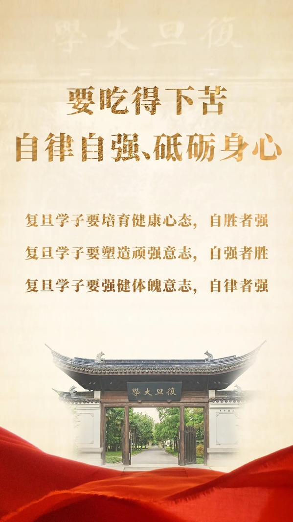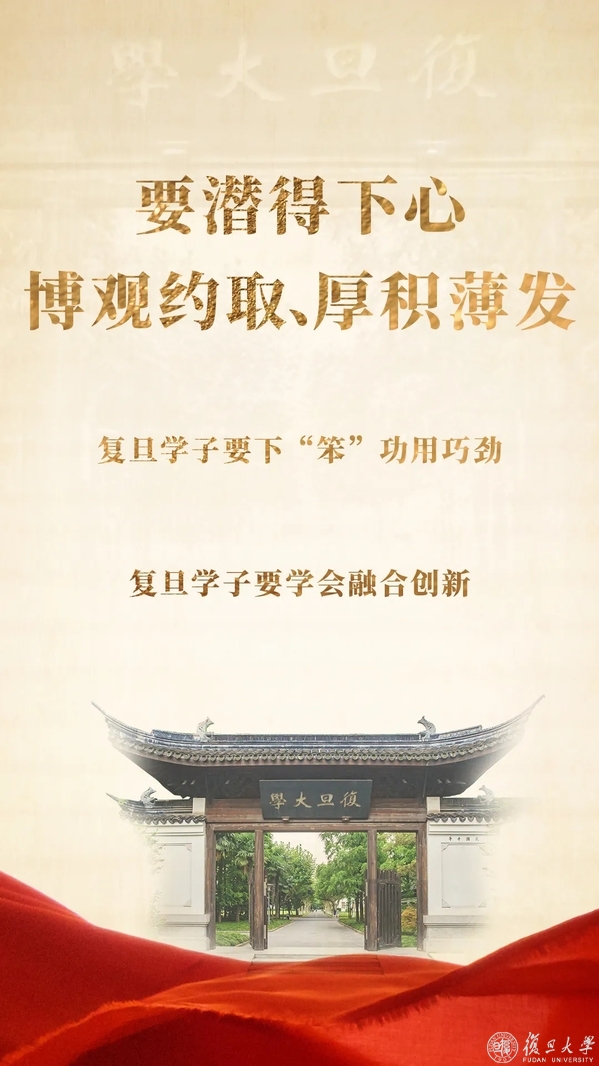要扎得下根,培基铸魂、笃志厚德。复旦学子要志存高远,用理想滋养初心、要心有浩然,用正气铸就底色;要潜得下心,博观约取、厚积薄发。复旦学子要下“笨”功用巧劲,要学会融合创新;要吃得下苦,自律自强、砥砺身心。复旦学子要培育健康心态,自胜者强、要塑造顽强意志,自强者胜、要强健体魄意志,自律者强;要俯得下身,实学实干、知行合一。复旦学子要积极融通一二课堂,要积极投身火热实践。
