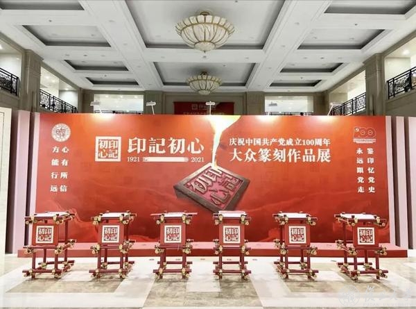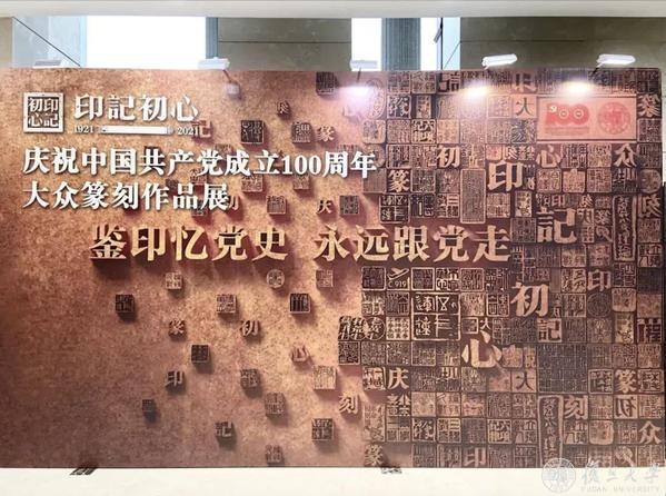 “印记初心——庆祝中国共产党成立100周年大众篆刻作品展”目前正在复旦大学光华楼志和堂展出。