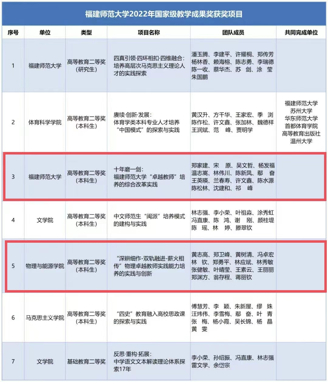 近日,教育部公布了2022年国家级教学成果奖获奖项目名单。我支部黄志高教授主持,郑卫峰教授等14位教师为主要完成人的教学成果《“深耕细作-双轨融进-薪火相传“ 物理卓越教师实践能力培养的实践与创新》荣获高等教育类(本科生)二等奖。这是学院自2009年获得国家级教学成果奖以来,时隔14年再次荣获的本科教学国家级成果奖。同时,由学校副校长郑家建教授主持,支部书记陈水源教授作为主要完成人之一的教学成果《十年磨一剑:福建师范大学”卓越教师“培养的综合改革实践》荣获高等教育类(本科生)二等奖。据悉,学校本届共有7个项目获奖,其中高等教育类(本科生及研究生)二等奖6项、基础教育类二等奖1项。