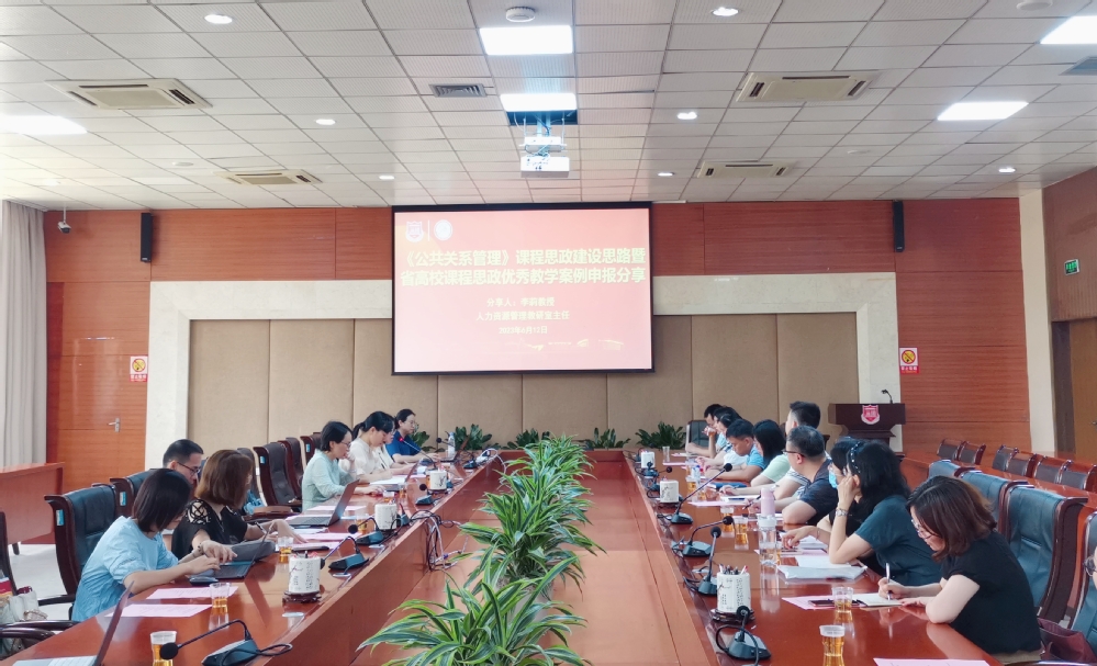 接着,人力资源管理教研室主任李莉教授围绕“《公共关系管理》课程思政建设思路暨省高校课程思政优秀教学案例申报”进行展示与分分享。在《公共关系管理》课程思政建设思路汇报中,李莉基于《公共关系管理》课程三大痛点,着重介绍如何致力于开展深度实践、激发职业志向的教学改革探索。她指出,《公共关系管理》课程始终以“服务社会”作为课程思政建设核心思想,教学内容上整合“三性”,突出“三力”,即教学内容兼具思想性、区域性和实用性,突出思想力、亲和力与生命力。在教学举措分享中,她重点阐述了如何遵循“知-体-用-悟”递进式的学习规律,开展“认知社会激发职业兴趣--服务社会产生职业认同--走进社会增进岗位匹配--奉献社会树立职业志向”的四阶梯进式深度实践教学,使课程多维度服务乡村、服务基层、服务企业,提高学生服务意识、塑造心怀家国、奉献社会的职业价值观。