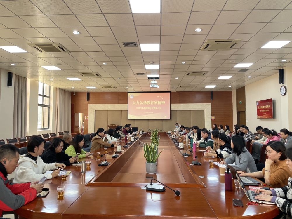为大力弘扬教育家精神,激励引导教师争做“四有”好老师,努力成为新时代的“经师”和“人师”,3月20日下午,我系在学院第六会议室召开“大力弘扬教育家精神”师德师风专题学习会,我系党总支负责人苏秋红、系主任雷金英、全体教职参加本次会议,会议由苏秋红主持。