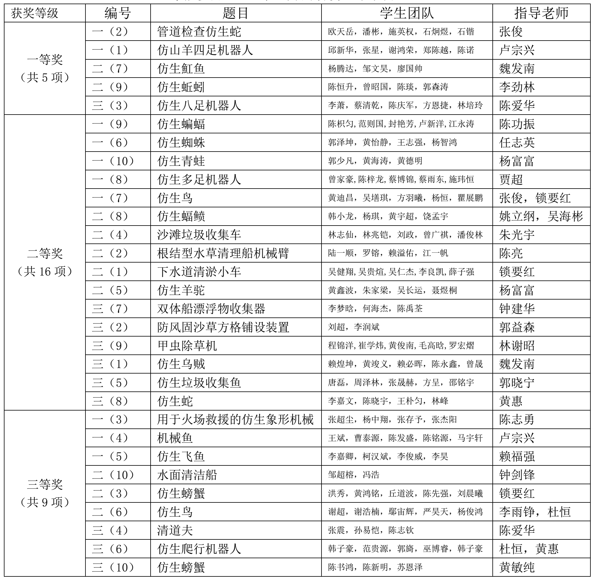 各组参赛队伍为本次校赛做了充分的准备。在比赛过程中,参赛选手们为评委老师详细介绍作品的设计理念、加工工艺和创新点,并且积极与其他队伍交流,探讨比赛的心路历程,相互汲取经验。评委们在听了选手的详细讲解和演示后,从创新性、结构设计、实用性等等方面进行公开评审,并为学生作品提出进一步的改进和提升建议。其中,管道检查仿生蛇、仿山羊四足机器人、仿生魟鱼等作品巧妙仿生,注重创新实践,突出实际用途,深受评委好评。最终,管道检查仿生蛇等五项作品荣获一等奖,仿生蝙蝠等16项作品获得二等奖,用于火场救援的仿生象形机械等9项作品获得三等奖。
