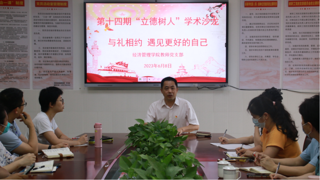 为进一步推动学习贯彻习近平新时代中国特色社会主义思想主题教育走深走实,加强师德师风建设,提升教师职业礼仪素养,塑造新时代的教师形象,6月8日下午,经济管理学院教师党支部在浈江校区会议室举行第十四期“立德树人”学术沙龙活动。经济管理学院院长刘春朝主持活动,教师党支部教学模范岗何美青主讲。