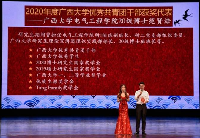 图1 范贤浩同志获广西大学优秀共青团干表彰晚会