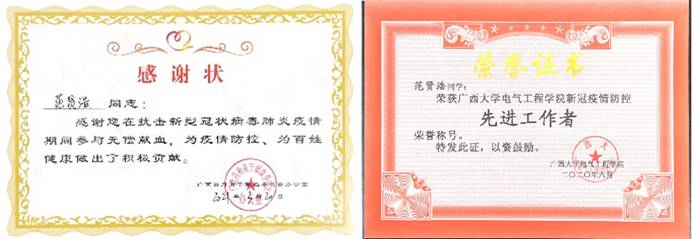范贤浩同志认为作为一名共产党员,我们必须脚踏实地,将共产党员的先进性体现在日常的实际行动中。在疫情爆发期间,范贤浩同志响应党的号召,通过无偿献血、主动担当抗疫志愿者等方式表现出研究生党员的责任与担当,并且积极关注疫情动态,与社区防疫工作者进行沟通交流,为疫情防控贡献出了自己的一份力量。在抗疫期间,范贤浩同志荣获了“广西大学电气工程学院新冠疫情防控先进工作者”,充分发挥了自己党员先锋的示范带头作用。