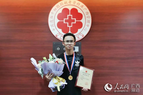 人民网南宁5月24日电 日前,广西大学新闻与传播学院新闻192班学生黄皓阳在柳州市工人医院捐献造血干细胞,成功救助一名远方的血液病患者生命,成为全国第9657例、广西第347例造血干细胞捐献者。同时,黄皓阳也是广西首位“00后”造血干细胞捐献者。