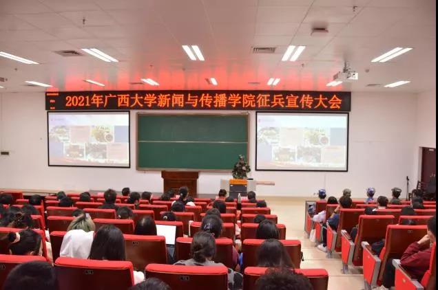 为充分激发我院新生参军入伍热情,帮助学生全面了解应征入伍流程与政策,12月21日,由广西大学武装部、广西大学退伍大学生之家联合组织的2022年春季征兵宣传大会在新闻与传播学院西报告厅举行。广西大学武装部军政科科长陈榕平、新闻与传播学院副院长朱学峰、团委副书记刘梦娟、辅导员黎明以及辅导员王志标出席本次活动,会议由朱学峰副院长主持。