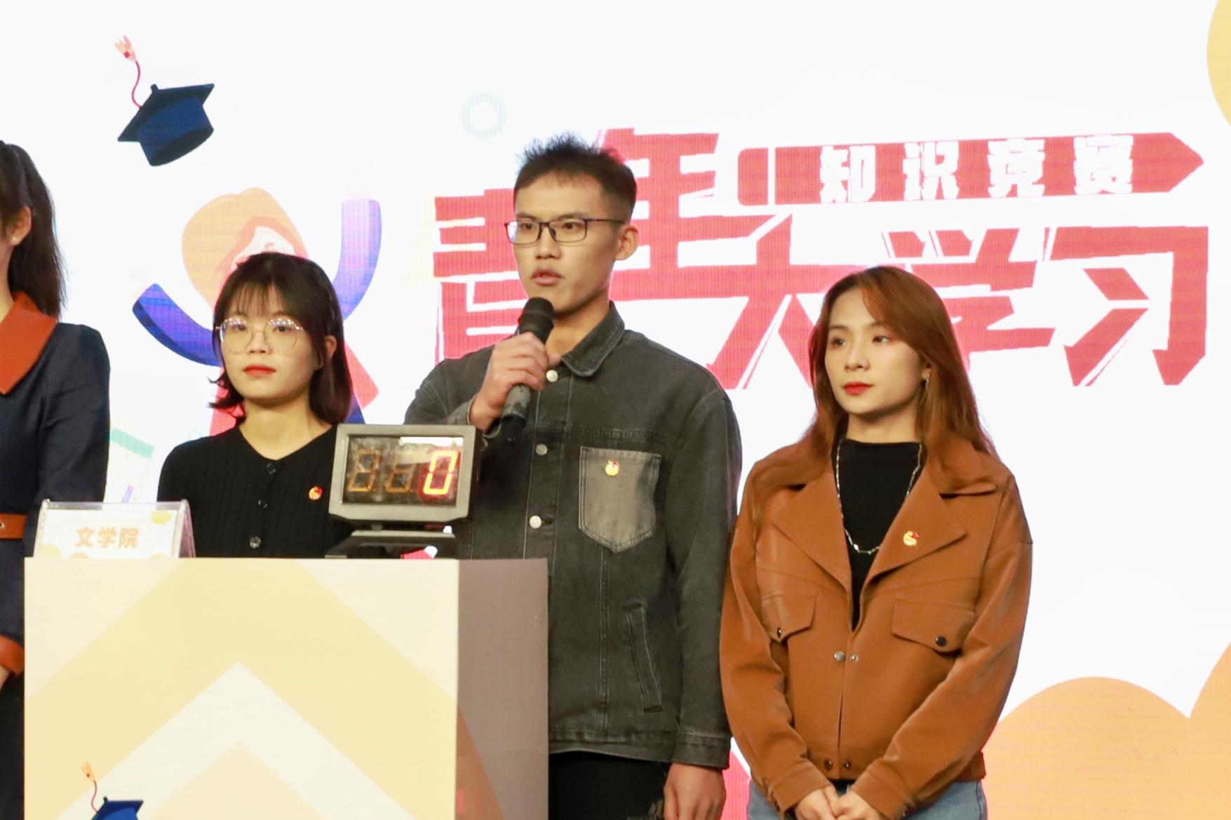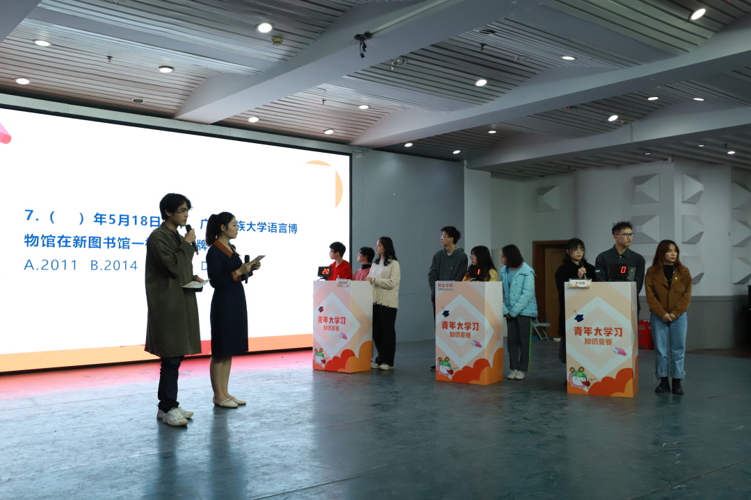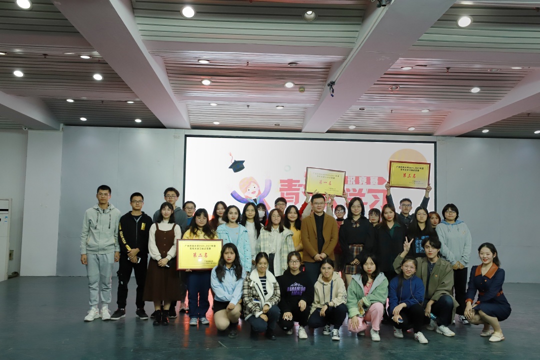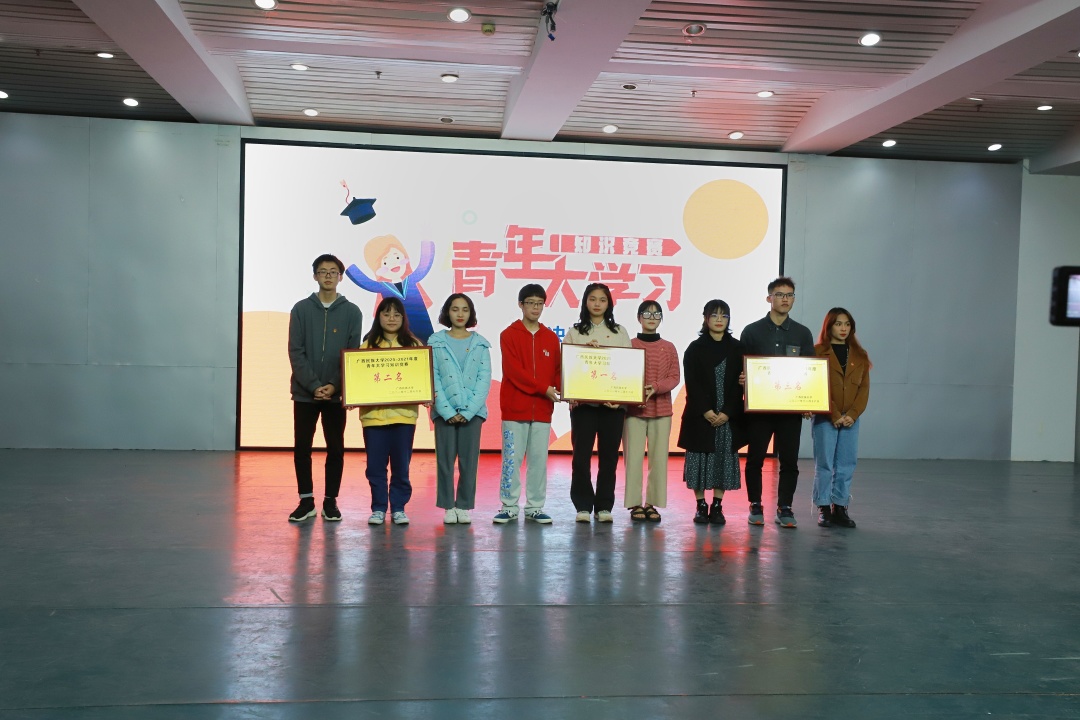 青春逢盛世,奋斗正当时。12月19日,我校青年大学习直播竞赛决赛在大学生活动中心201室火热开赛。文学院、传媒学院、材料与环境学院、化学化工学院、民族学与社会学学院、政治与公共管理学院六支代表队进入决赛,共同角逐冠亚季军。文学院2020级汉语言文学写作班方仕仗、黄秋兰,2020级汉语言文学师资3班韦玉霜三位同学代表文学院参赛。校团委宣传部副部长陈宇鹏以及部分学生到场观赛。经过激烈的角逐,文学院最终以115分的积分荣获季军。