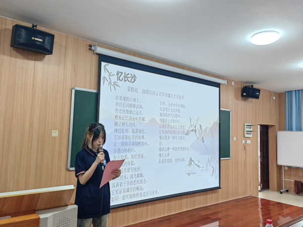 杨荔斌老师在开场发言中,首先感谢学院领导和各位老师对卓越班的关心和支持,并对湖南长沙主题研学进行了简要的回顾和总结。随后,陈思颖、陈雪琴、王彩蓉、蒙程瑶四位同学以诗歌和散文分享了她们心中的“长沙印象”。