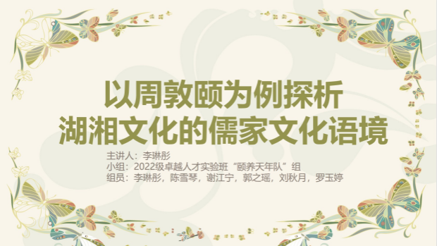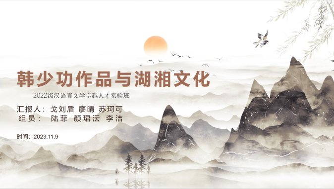 在“湖湘流脉”主题部分,来自22级卓越班的三个研学小组,分别作了题为《探究湖湘文化之经世致用思想》《以周敦颐为例探析湖湘文化的儒家文化语境》《韩少功作品与湖湘文化》的研学报告。黄焱和覃麒谕的感怀散文情思隽永,苏珂可的一首《访湖湘》荡气回肠。