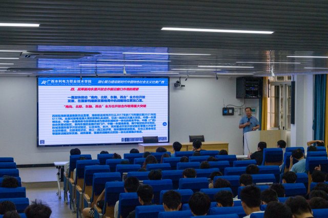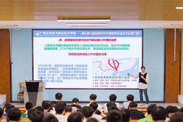 习近平总书记2021年4月在广西考察时发表的重要讲话,是针对区位特点为广西发展明确的科学定位,是着眼全国大局为广西发展赋予的崇高使命。专题辅导讲座围绕凝心聚力建设新时代中国特色社会主义壮美广西,从巩固脱贫攻坚成果同乡村振兴有效衔接、建设铸牢中华民族共同体意识示范区、加快建设美丽广西构筑南方生态屏障、发挥面向东盟开放合作前沿窗口作用、你我携手同行助力广西经济高质量发展等五个方面,通过精美的课件、详实丰富的数据,向同学们展现了建设新时代中国特色社会主义壮美广西画卷。作为水电特色鲜明的创新型高职院校,学校十分注重把人才培养、行业服务、国际交流等工作融入建设新时代中国特色社会主义壮美广西,积极响应国家“一带一路”倡议,2022年5月19日中国—东盟能源职业教育高质量发展论坛暨中国—东盟能源职业教育联盟成立开幕式在学校举办,进一步促进了中国与东盟水利、电力部门、教育部门、水电院校、企业、行业协会之间的合作与交流,共同研讨新发展格局下中国—东盟能源职业教育发展的现状与未来。
