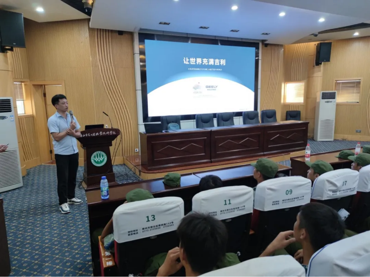 为了更好地促进2021级汽车检测与维修技术专业大一新生深入地了解所学专业的行业背景、课程设置、教学现状、发展前景以及汽检专业就业情况,树立专业信心,让新生在学习中做到有的放矢,更好的规划自己的大学生活。2021年9月29日下午在学校第二报告厅召开了“2021级汽车检测与维修技术专业新生专业教育暨吉利“成蝶班”开班仪式”会议,汽车检测与维修技术专业负责人李敏主持会议,浙江吉利汽车汽车集团技能管理部产教融合主管马玺钧、浙江吉利汽车汽车集团杭州湾生产基地HR刘瑞以及大一全体汽车检测与维修技术专业学生参加了此次会议。