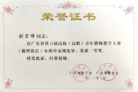 我院教师刘宏烽获广东省第六届高校(高职)青年教师教学大赛一等奖,取得了新的突破,创造了我院在此项比赛中的最好成绩。