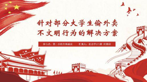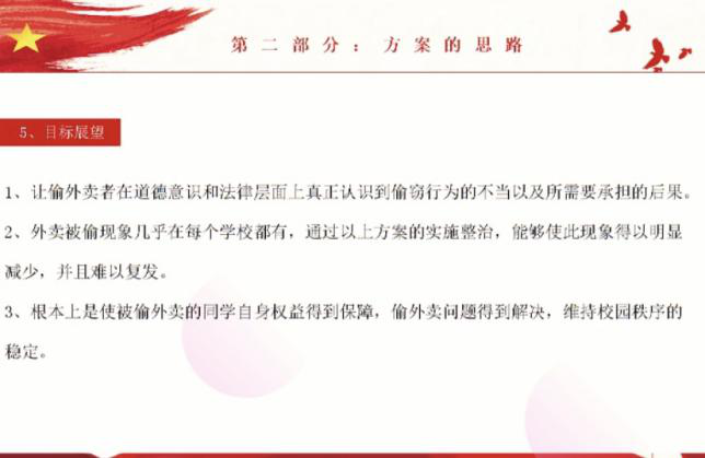 该小组阐述了大学生偷外卖事件的产生原因并对此提出了解决方案,希望偷外卖者在道德意识和法律层面上真正认识到偷窃行为的不正当以及所需要承担的后果,让同学们的自身权益得到保障,使校园秩序得到维护。